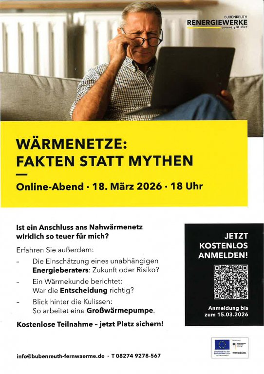 Die Firma GP JOULE hat die Bürgerinnen und Bürger im ersten Bauabschnitt des Nahwärmenetzes zu einer kostenlosen Online-Informationsveranstaltung unter dem Titel „Wärmenetze: Fakten statt Mythen“ am Mittwoch, 18. März 2026, um 18 Uhr eingeladen. Dazu wurden bereits Einladungsflyer verteilt.
