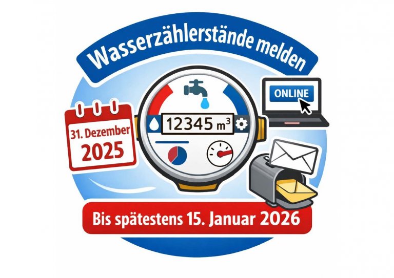 Mitte Dezember erhalten Sie per Post einen Brief, mit der Bitte, den Zählerstand Ihres Hauptwasserzählers bzw. falls Sie einen Gartenwasserzähler bei der Gemeinde angemeldet haben, auch diesen Zählerstand bis zum 31.12.2025 an uns zu übermitteln.