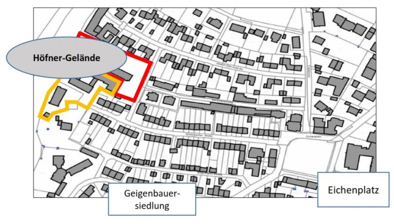 Das Höfner-Gelände mit einer Größe von knapp 0,8 ha (= 8.000 m2) liegt unmittelbar an der Trasse der viergleisigen Hauptbahn München – Berlin am Rande der Geigenbauersiedlung. Es besteht aus teilweise noch intensiv genutzten Gewerbeanlagen aus den 50er Jahren und dominanten Grünflächen. Es handelt sich im Wesentlichen um insgesamt vier Grundstücke.