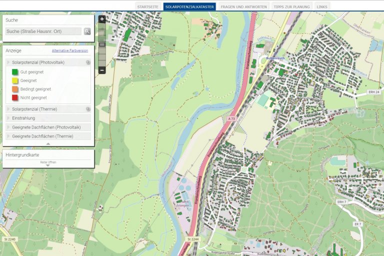 Wie gut Dachflächen für solare Nutzung geeignet sind, können Bürgerinnen und Bürger aus dem Landkreis Erlangen-Höchstadt und der Stadt Erlangen ab sofort über ein webbasiertes Portal kostenlos ermitteln: