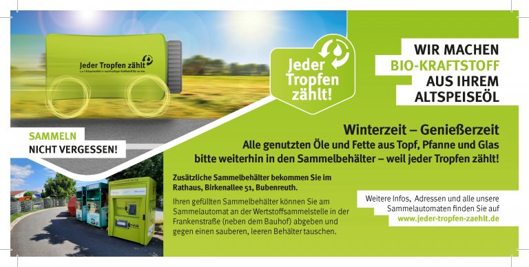 Die Gemeinde Bubenreuth nimmt seit August 2021 an dem Projekt „Jeder Tropfen zählt“ teil. Dabei handelt es sich um die Sammlung von Altspeisefetten und –ölen aus Privathaushalten.